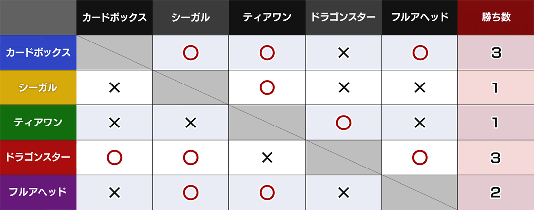 - ・各チームすべてのバトルを異なるメンバーで対戦