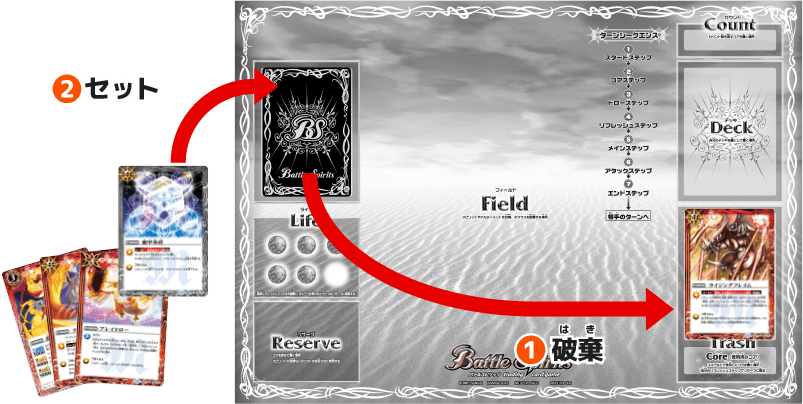 なお、バーストエリアにはバーストを1枚しかセットできません。すでにバーストがセットされている場合には、❶そのカードを破棄してトラッシュに移し、❷代わりに手札のカードをセットしてください。