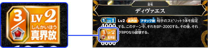 カードの中には、Lvの欄に「真界放」のキーワードがあるものがあります。このようなカードは、指定された数のコアを置くほか、ソウルコアを上に置くことでも、レベルアップの条件を満たすことができ、さらに「真界放状態」になります。