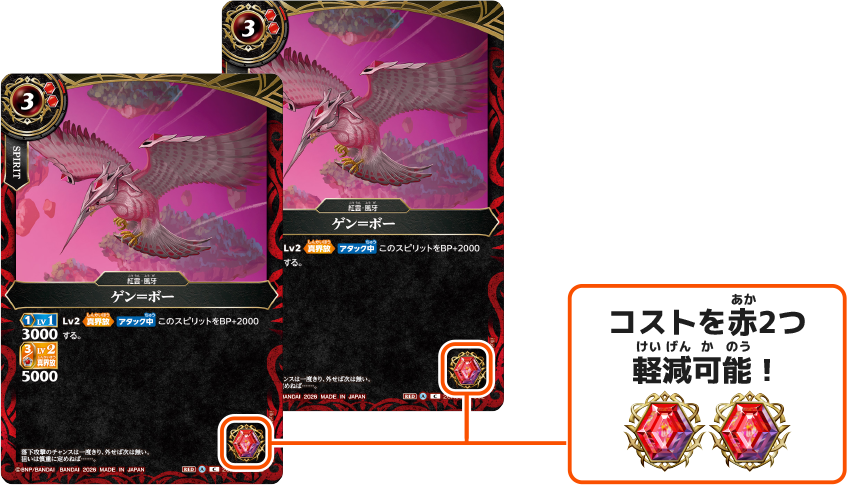 それから、フィールドにあるシンボル(赤2)でコスト軽減を行うと、実際に支払うコアは7(コスト)−2(継召による軽減分)−2(フィールドのシンボルによる軽減分)=3個となります。